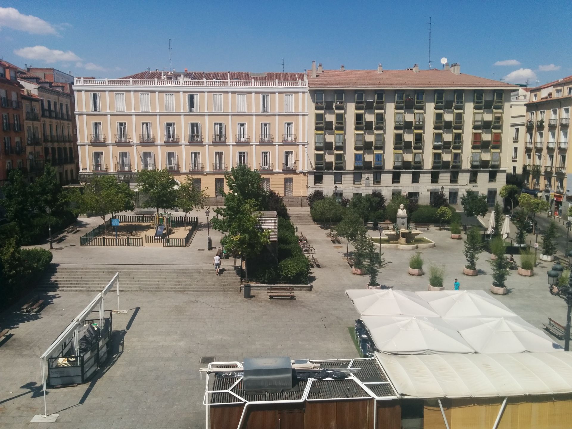 Mesonero imagino un bloque de viviendas de cinco plantas, contando las superiores con una terraza corrida que discurría por todo el edificio, tal y como vemos en el cuadro que adornaba su despacho. No obstante, en una primera instancia tuvo que conformarse con un edificio mucho más reducido, con tres plantas, según el proyecto presentado al Ayuntamiento en 1844 y conservado en el Archivo de Villa. Más adelante, en 1861, presentó una solicitud para añadir una planta, reforma que se prolongó 3 años después con la anexión de la casa contigua por la calle de San Bartolomé.