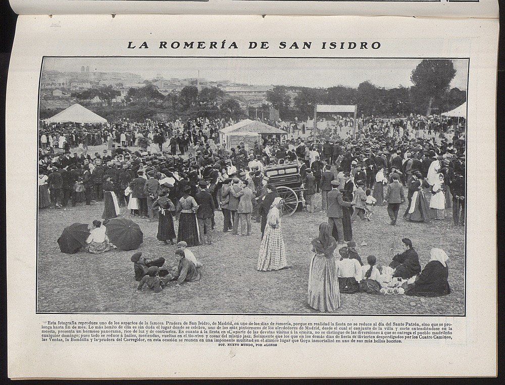 "Esta fotografía reproduce uno de los aspectos de la famosa Pradera de San Isidro, de Madrid en uno de los días de romería, porque en realidad la fiesta no se reduce al día del Santo Patrón, sino que se prolonga hasta fin de mes. Lo más bonito de ella es sin duda el lugar donde se celebra, uno de los más pintorescos de los alrededores de Madrid...